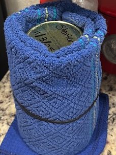 My friend Darci was the one who told me about using bread flour instead of all purpose flour when feeding your sourdough starter. Another tip she gave me was to put my sourdough jar in a fuzzy sock to keep it warm. The point of keeping your sourdough starter warm is the same as wanting your bread dough warm…..TO HELP IT RISE! I wasn’t able to try this because I didn’t have any new fuzzy socks at the time and the idea of using a used sock even if it was clean made my stomach feel queasy. I opted for hand towels and used a hair tie to help keep it in place.