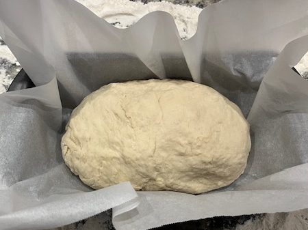 I let it rise the full 8 hours that the recipe called for, but it still wasn’t over the rim. If you read my last bread post then you know I had this same issue. We are in December and have colder weather so I decided to crank up the heat in the house and let it sit another hour or two.