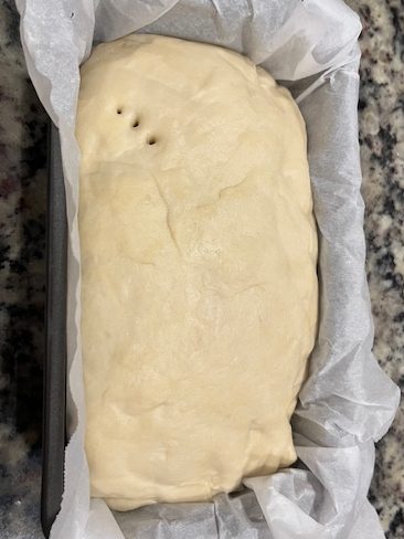 The ingredients called for: Water, Starter, Honey, Oil, Salt, & Bread Flour. I didn’t want to use oil so I substituted butter. After mixing everything together, I kneaded the dough for about 5 minutes or so before placing it in the loaf pan to rise. Please see the recipe on my links & supplies page if you would like to try it out. I placed my bread on parchment paper before transferring to the loaf pan. I use parchment paper for easy cleanup and it ensures my bread will not stick to the bottom of my pan.