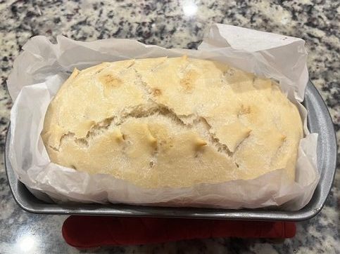 I tried to do a fun design with my food scissors, but it did not turn out good. Eventually, I will get a scoring tool so I can make all the fun designs I see everyone doing. I highly recommend this recipe and will be making it again! The only thing I would change is to take the top loaf pan off for the last 20 minutes or so to brown the top of the bread. Stay tuned to see what I make next!