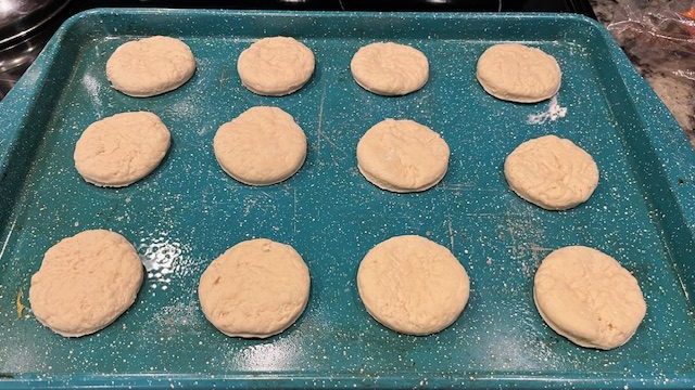 I don’t have a mixer, but if you do then I recommend using it because your hands WILL GET TIRED! First, you need to preheat the oven to 425 degrees. Then we mix our ingredients being careful not to over mix. The recipe recommends using a rolling pin, but if your like me and haven’t purchased one yet then flatten it out as best you can with the palm and heel of your hand. I cut my biscuits out using a jar lid, but they came to a little small in size. This idea would work better with a bigger size jar lid. Anything you can use to make it a circle would work in my opinion haha.