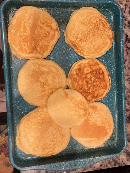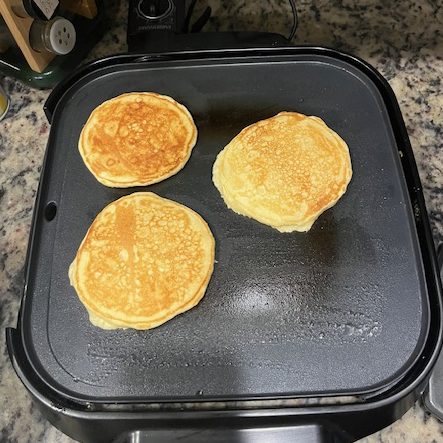 I used a 1/4 cup to spoon the batter onto my Faberware grill. I used this so I could cook three to four pancakes at a time. If you’re like me and don’t want to stand on your feet forever then I recommend using one of those or a similar flat cook top. These will cook like regular pancakes.