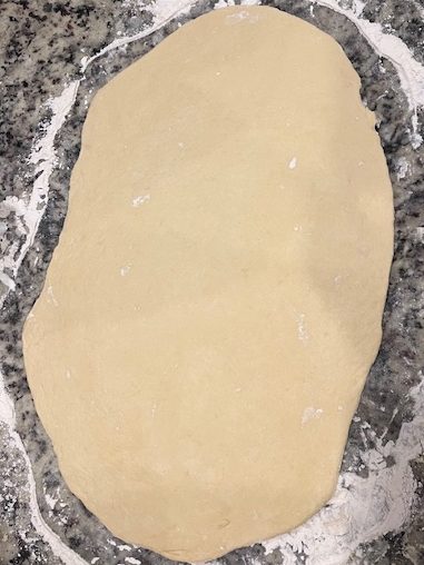 Make sure you give yourself enough counter space to work with your dough. Pour out your dough onto a lightly floured surface. Then, fold the dough into itself until all the flour has been incorporated and you can still see bits of butter. Roll out your dough with a rolling pin until you have a 6 by 9 rectangle.