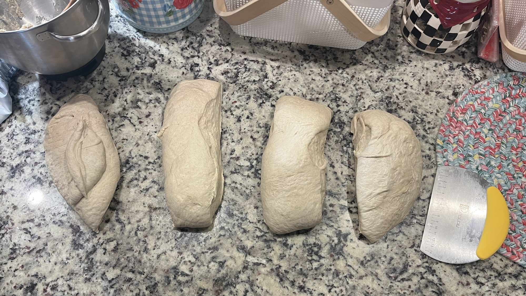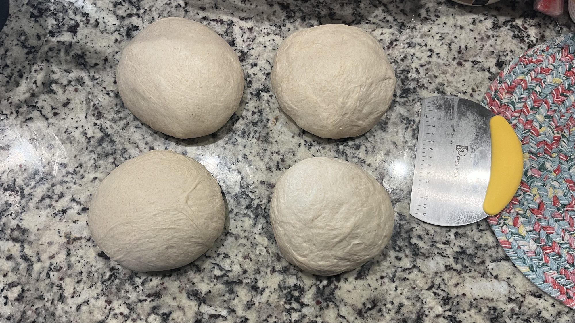 After I took my cover off, I was so glad I had put oil on the top because it came off so easily and didn’t have my dough going a billion different directions. Turn your dough out onto a lightly floured surface. If you have a bench scraper as pictured below then get it and cut your dough into 4 equal parts.