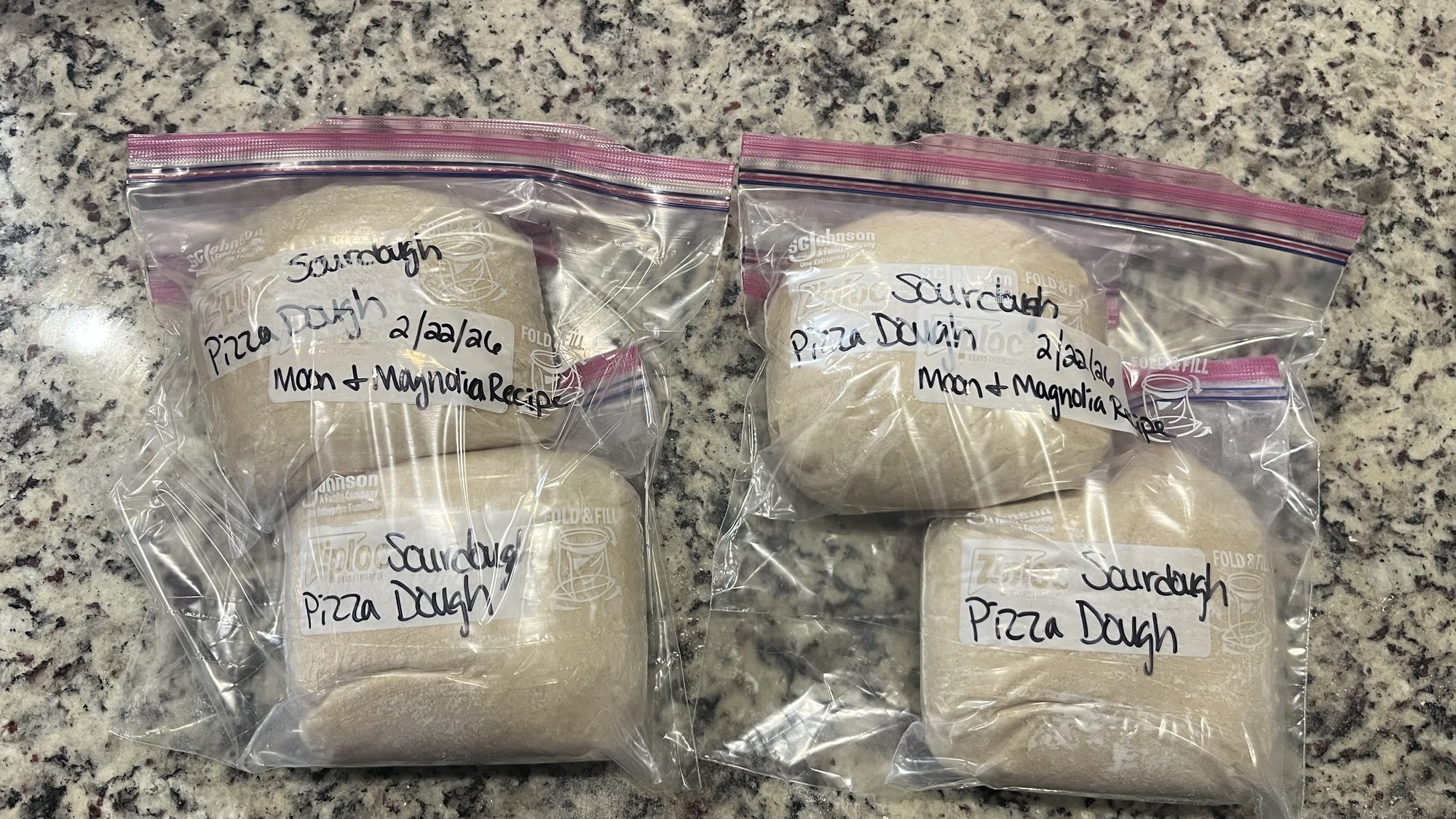 Now it is time to put them in our freezer bags! If you’re like me and didn’t know you were out of freezer bags then grab 4 quart bags and 2 gallon bags. When in doubt, double bag it! Lightly flour your dough balls and place them each in a quart size bag. Squeeze out as much air as you can without completely crushing your dough and then place two each in the gallon bags.