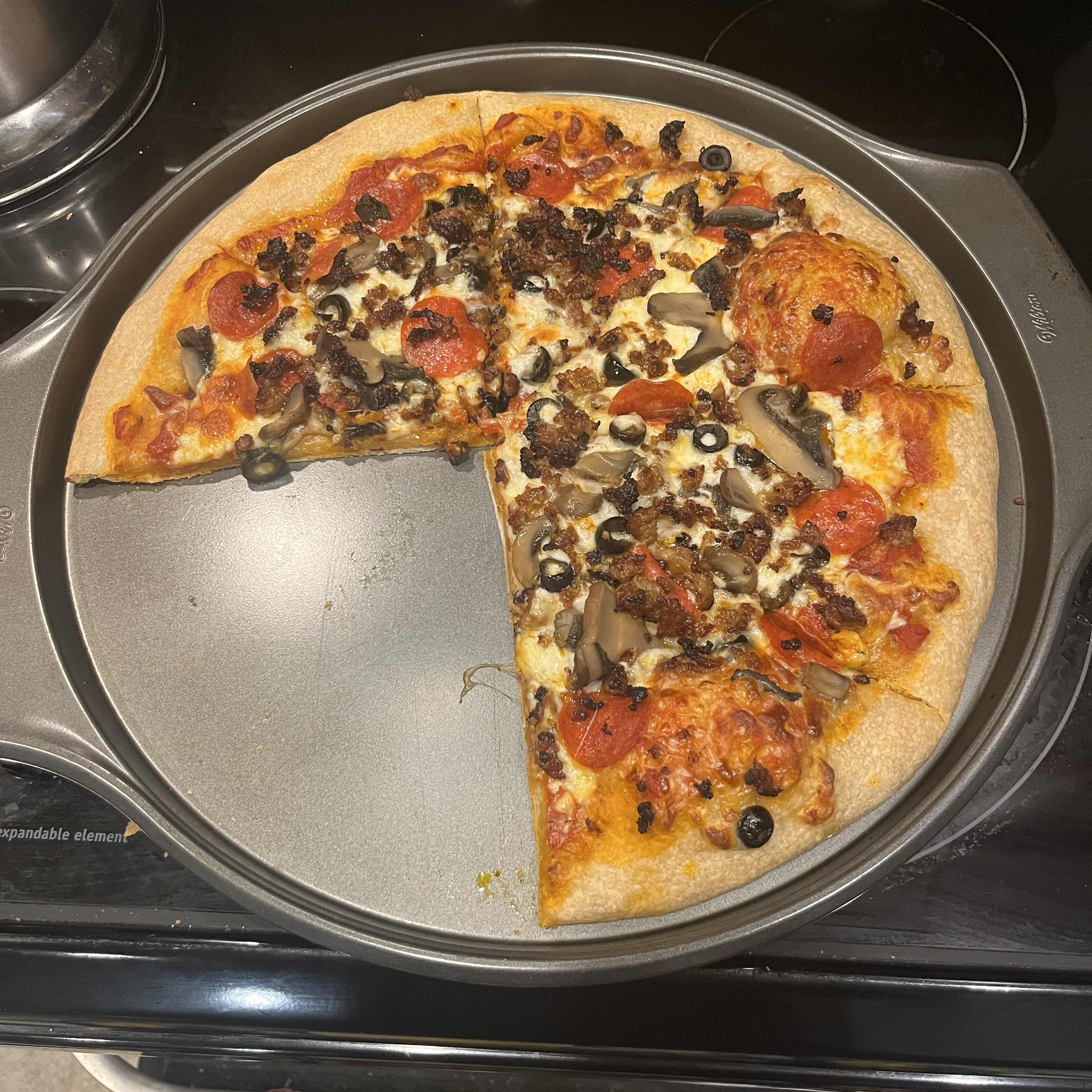 I forgot to take a picture of mine, but I promise you it was delicious!! Enjoy the picture of my husband’s pizza below. He decided to dig in before I snapped a photo. I will definitely make this recipe again! If you enjoyed following along, click that subscribe button!